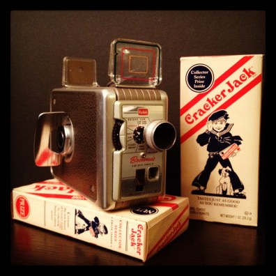 Kodak Brownie 8MM Movie Camera II, f/1.9 lens circa late 1950’s & vintage Cracker Jack packaging.